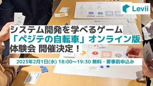 システム開発を疑似体験できるレヴィオリジナルのボードゲーム教材「ペジテの自転車」の体験会を開催します! 体験会では、すでにたくさんのお客様や大学の授業などでご好評を頂いている**ペジテの自転車オンライン版**をプレイして頂くことができます。 ど…